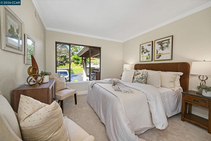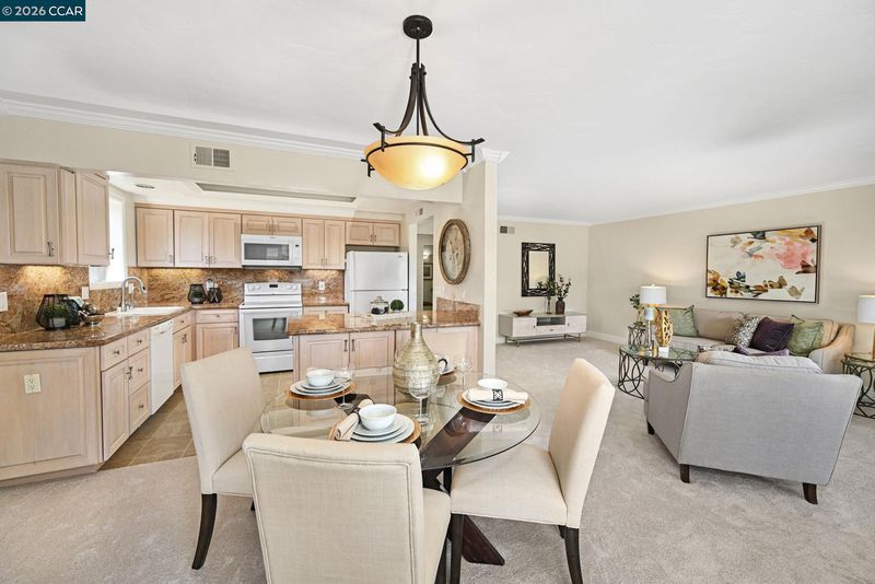 Welcome to Rossmoor living at its finest. This beautifully updated 2-bed, 1-bath Sequoia Wrap Model features new carpet, fresh paint, and a modern feel throughout. The kitchen offers granite counters and ample cabinetry, opening to a living and dining area that flows through double doors onto an expansive wrap deck with stunning Mt. Diablo views. Both bedrooms include closet organizers and mirrored doors. Crown molding, smooth ceilings, a skylight, and an indoor stacked washer/dryer complete the package. Enjoy resort-style living in this gated community with pools, golf, tennis, pickleball, a movie theater, farmer's market, and endless social and recreational amenities, most an easy walk from this manor close to the Gateway Clubhouse — a vibrant, active lifestyle in a serene valley.