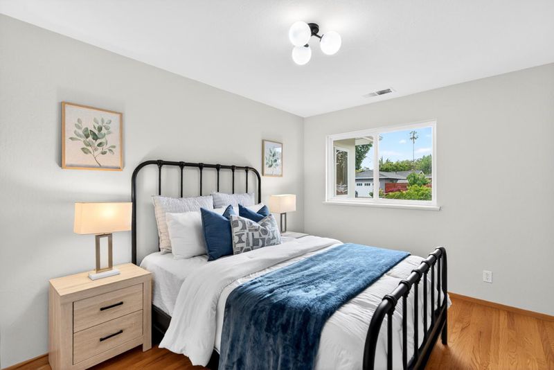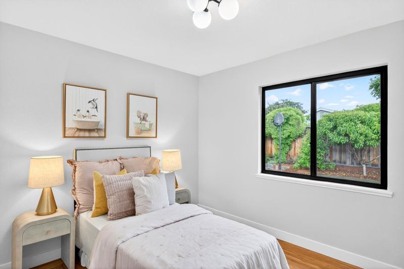 Newly remodeled charmer with owned solar, new reflective roof and upgraded 200-amp electrical panel, ideally nestled in the peaceful and highly sought-after Cuesta Park neighborhood. Just steps from Top-Rated schools, the iconic Cuesta Park and downtown Mountain View with its Caltrain/Light Rail connection. Inside, refinished Lebanese oak flooring flows throughout, complemented by fresh interior paint and an abundance of natural light from dual-pane windows and a skylight, creating a warm and inviting atmosphere. A cozy fireplace anchors the main living space, while heat/AC provide year-round comfort. The kitchen features brand-name appliances, Formica countertops and vast cabinet space. All bedrooms are comfy with their own closets, while the primary suite offers a private en-suite bathroom with stall shower. Additional highlights include a 2-car garage with washer, dryer, and utility sink, as well as a sep family room ideal for an office. The gorgeously landscaped, drought-resistant backyard is designed for both relaxation and entertaining, complete with a overhang and mature fruit and citrus trees. Conveniently located near major tech campuses including Meta, Google and LinkedIn, with easy access to Highways 85, 101 and 237. Dont miss this Cuesta Park gem. It will go FAST!