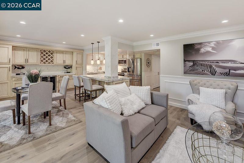 Where else can you find this level of design, space, and location for under $600,000? Move right into this , beautifully remodeled Sonoma Model with exceptional care and attention to detail. Classic charm meets modern comfort with elegant wainscoting, rich engineered hardwood floors, and sleek porcelain countertops anchoring the open-concept kitchen. Enjoy a dual-zone wine fridge and a Samsung 65" TV already mounted for effortless living. The remodeled primary bath offers a dual vanity, walk-in shower with waterfall head and custom bench, plus a fog-free beauty mirror with adjustable lighting. The guest bath features the same timeless, high-end finishes. A fully enclosed balcony provides flexible bonus space—perfect for an office, reading nook, or art studio. Ideally located just steps from the Hillside Clubhouse, with convenient access to the pool, lawn bowling, and more.
