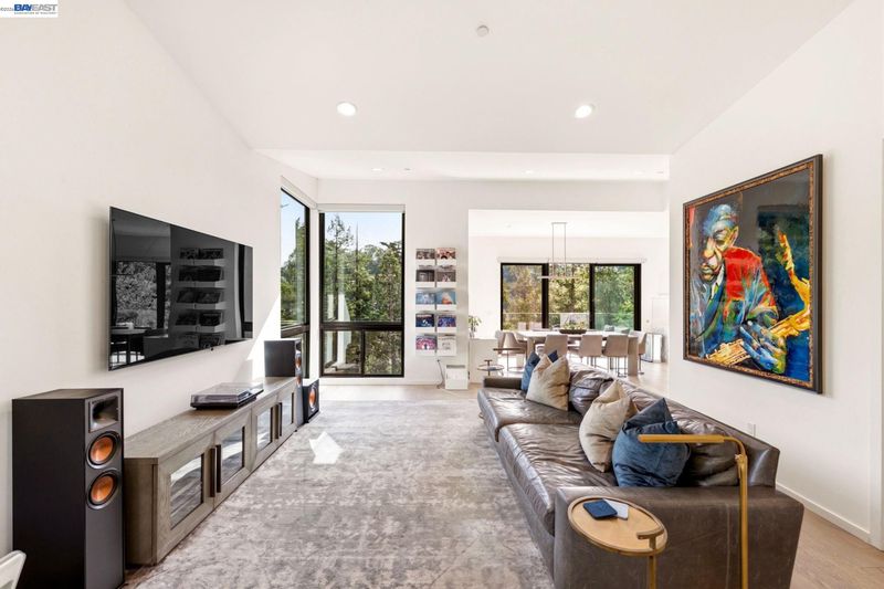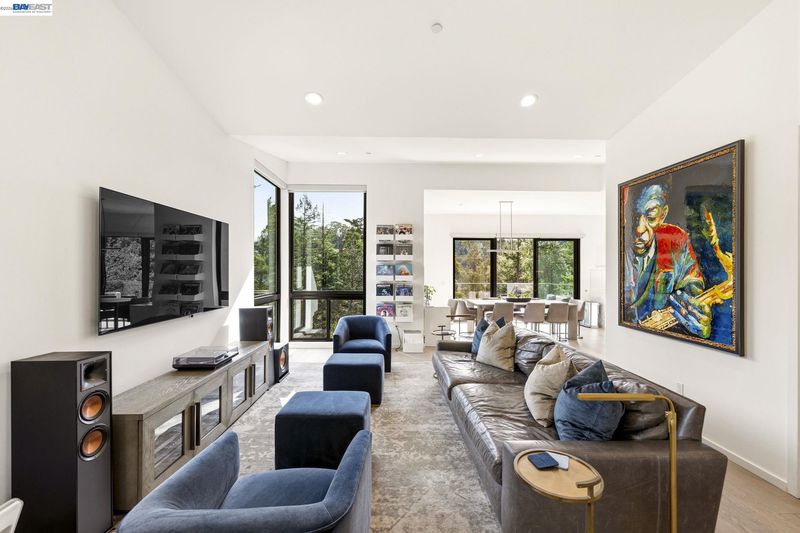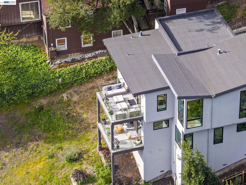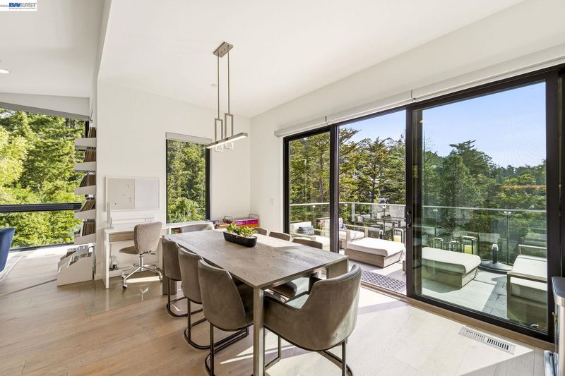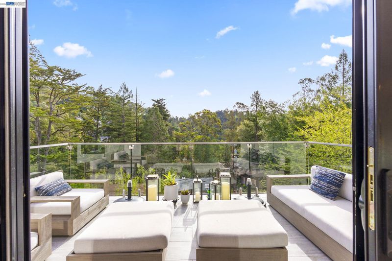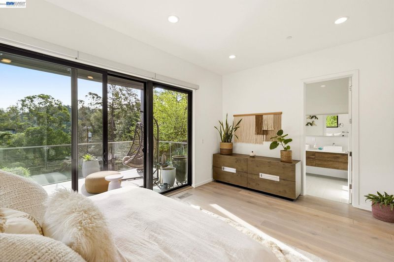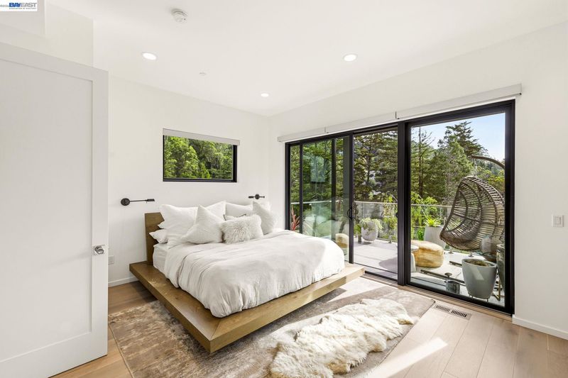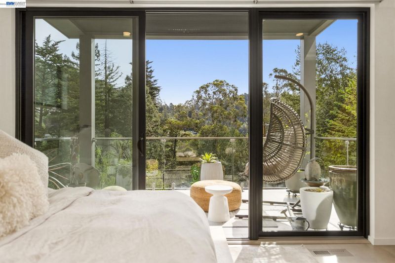 Designed by Oakland-based, boutique residential design architect John Newton, 45 Homeglen is a striking modern residence tucked on a quiet lane in Montclair—minutes from the shops, restaurants, & vibrant Sunday mornings of Montclair Village. This 2020-construction home has been thoughtfully designed and meticulously maintained. An open floor plan welcomes you with oversized windows framing lush views from nearly every room. It feels like living among the treetops—even from the chef's kitchen, with marble countertops, a waterfall island, sleek appliances, & designer fixtures. Dining and living areas are crowned by a signature butterfly roof for dramatic ceiling height and wonderful scale. An oversized sliding door opens to a glass-walled deck with peaceful verdant views. The lower level offers a serene primary suite w sunny bath and direct deck access, two additional bedrooms, and another full bath. Upgrades include A/C, whole-home reverse osmosis, motorized shades, and a customized storage. The rear yard has exciting potential—a garden, or a perhaps a detached structure (ADU plans avail). Ample storage and a 2-car garage w/ internal access. Close to Huckleberry and Sibley Regional Parks, coveted Montclair schools, and the wooded setting that makes Homeglen Lane so special.