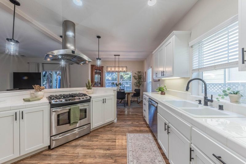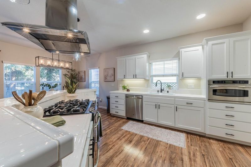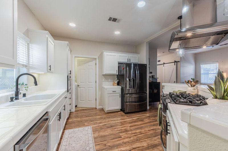 - Countertop - Tile, Dishwasher, Hood Over Range, Microwave, Exhaust Fan, Oven Range - Gas, Refrigerator