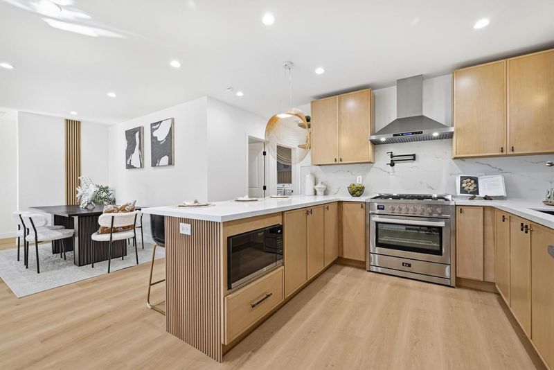 - Cooktop - Gas, Countertop - Quartz, Dishwasher, Garbage Disposal, Island, Microwave, Oven Range, Refrigerator, Wine Refrigerator