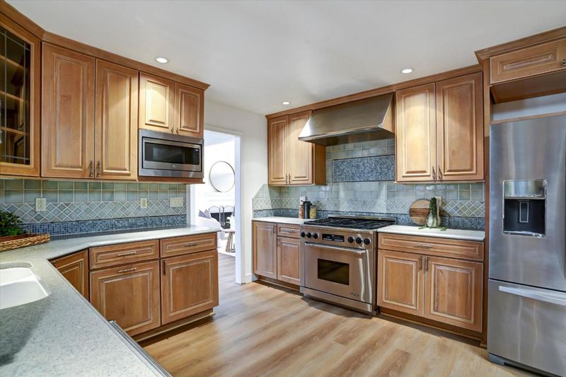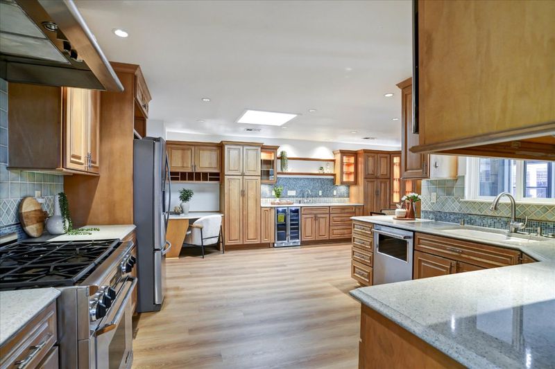 - Cooktop - Gas, Countertop - Quartz, Exhaust Fan, Hookups - Ice Maker, Oven Range - Gas, Refrigerator, Skylight, Wine Refrigerator