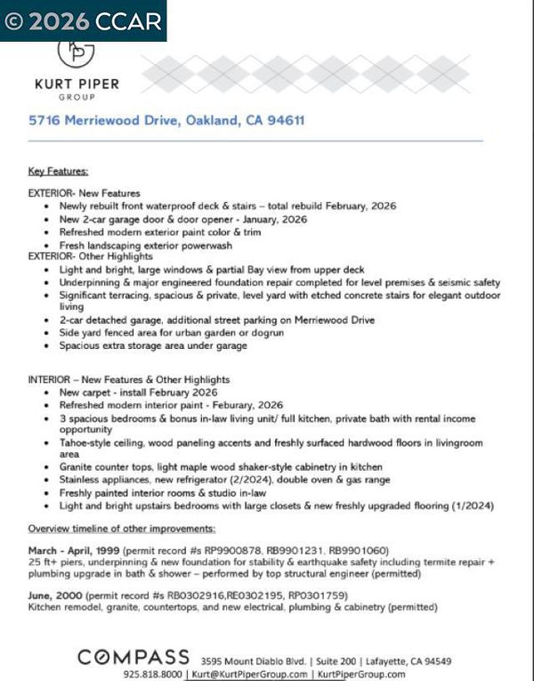 Two units on one property with strong income potential—live in one and rent the other or maximize returns as an investment. This beautifully updated 1925 cabin-style property in Montclair features a 3 bedroom, 1.5 bath main residence (approx. 1,538 sq. ft.) and a separate lower-level studio apartment (approx. 438 sq. ft.). Proven income history with the main home previously leased at $4,700/month and the studio at $1,800/month. The main home blends rustic charm with modern comfort, showcasing a stone fireplace, hardwood floors, wood-framed windows, exposed beam ceilings, and classic paneling. The remodeled kitchen features natural wood cabinetry and upgraded stainless-steel appliances including a gas cooktop, double ovens, built-in microwave, and dishwasher. The studio apartment offers a private entrance, full kitchen, and separate bath, ideal for rental income, guests, or extended family. Set among stately oaks, the property features stamped concrete walkways, outdoor patios, a level terraced yard, and a new front deck with filtered views of downtown Oakland and a glimpse of the Bay. A detached two-car garage/storage unit adds convenience. Ideally located just minutes from downtown Montclair, shops, dining, and easy access to Highways 13 and 24, Montclair is a pedestrian friendly village giving it a true, small town feel, yet just minutes to Oakland, Berkeley and San Francisco. Open 4/19 2-4 PM.