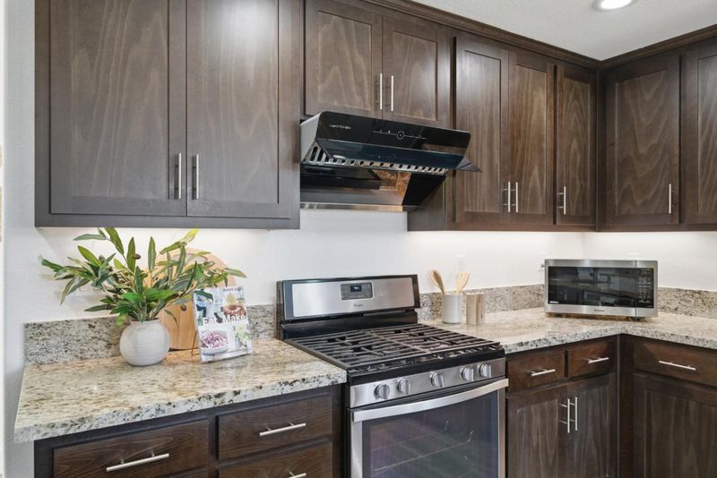 - Countertop - Granite, Dishwasher, Island with Sink, Garbage Disposal, Exhaust Fan, Oven Range - Gas, Refrigerator