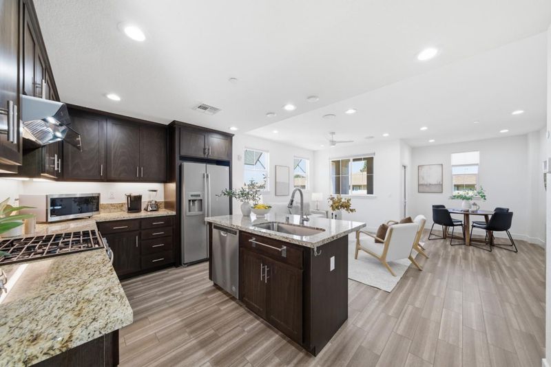 Set back from the street, Bright south-facing end-unit with modern upgrades, enhanced privacy, and walking distance to Ranch 99! Less than 7 years new, this home features an open-concept layout with high ceilings, recessed lighting, and built-in ceiling speakers. Sunlight fills both the living areas and bedrooms throughout the day. The kitchen is designed for both functionality and style, featuring shaker style cabinets, a center island with timeless granite countertops and gas burner range, seamlessly connecting to the living and dining areas, Perfect for everyday living and entertaining. Upgraded with wood-look tile flooring in main living areas and bathroom for a clean, modern look with easy maintenance. Comfortable bedrooms include a walk-in closet, providing ample storage and a cozy retreat. Enjoy a Sun-filled balcony, along with charming details such as an arched entry, decorative metal window awnings, and a welcoming paver courtyard. Convenient access to Hwy 880 & 84, and the Dumbarton Bridge, Paseo Padre Pkwy & Decoto Rd, major tech shuttle routes & UC Bart, walking distance to Ranch 99, restaurants, N Gate Community & Grandal Greek Park. Located in highly sought after award-winning school district: Patterson Elementary (8) Thornton Middle (9) American High (10). --